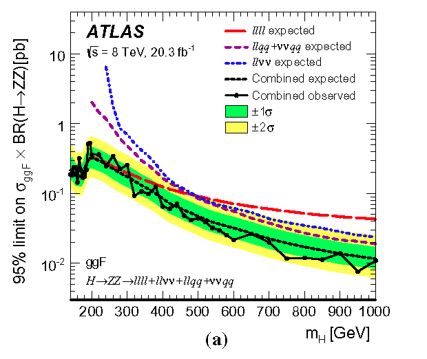 95 \% CL upper limits on $\sigma BR(H \rightarrow ZZ)$ as a function of mH...
