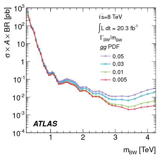 upper limits on $\sigma$ A for a BreitWigner narrow resonance produced by a gg initial state decayin...