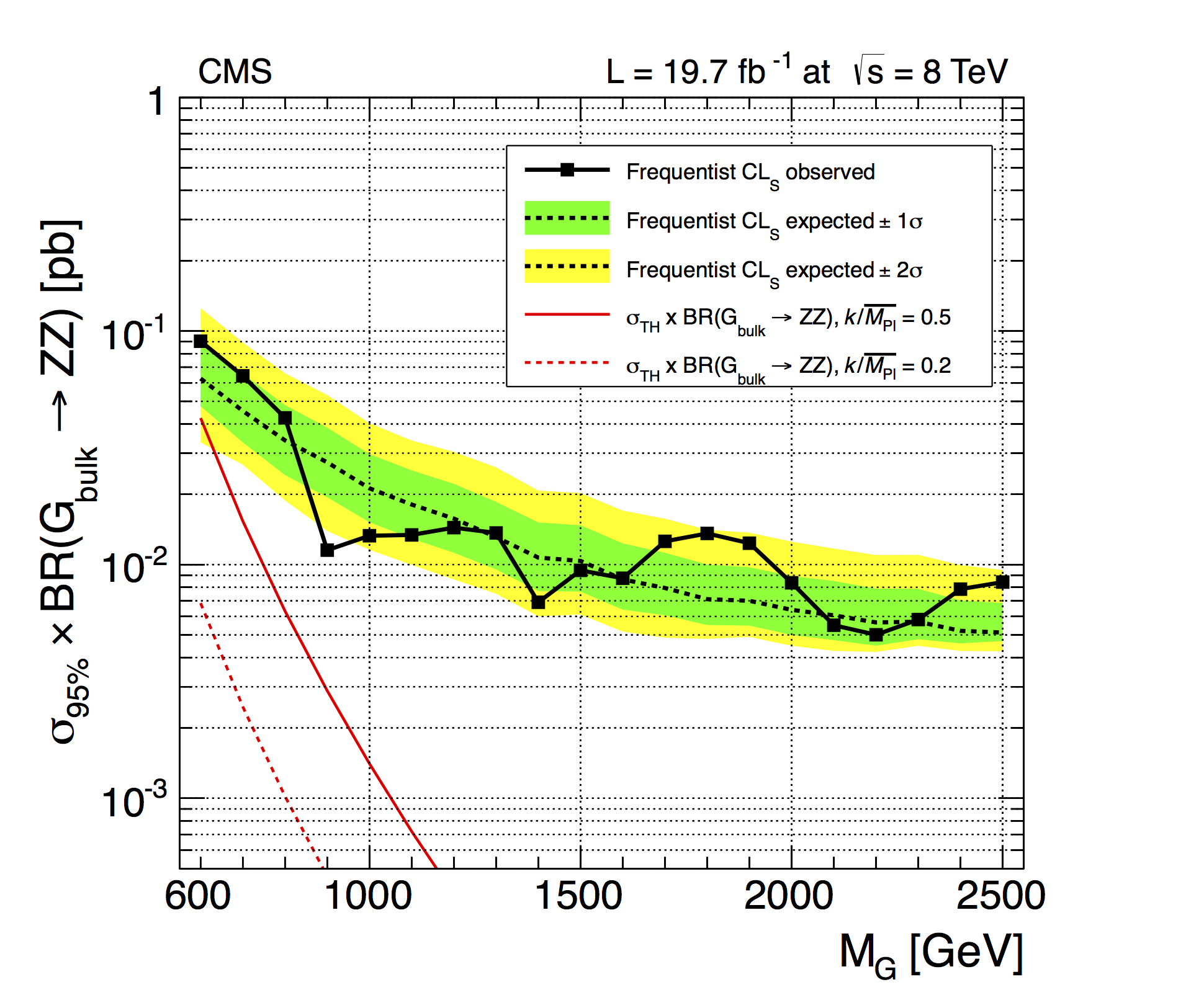 Cross-section x BR(G_bulk->ZZ) vs MG of graviton production...